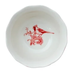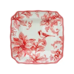Make your holiday table cheerful and bright with the Christmas Lane dinnerware collection from 222 Fifth. Inspired by our best-selling Adelaide dinnerware sets, the Christmas Lane collection features a charming winter woodland scene with sprigs of holly, bright poinsettias, and a cheerful cardinal, all on a background of lovely white porcelain. Framed by a stylish scalloped red border, the form and color of these pieces give an elegantly modern feel to the timeless appeal of the Toile patterns that inspired them. This dinnerware set is delightful, expressing the joy and comfort of coming home for the holidays. There are 16 pieces in this dinnerware set, including four square dinner plates, four square salad plates, four bowls, and four mugs.