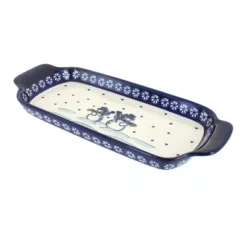 13.25″ long x 5.75″ wide – great dish for serving a loaf of bread with your dinner or appetizers on a buffet! The Art of Polish Pottery, as we know it today, started as local folk art centuries ago in the German province of Silesia. The first known pieces of “Bunzlauer” stoneware dating back to the 16th century were crafted by hand and decorated with a folk art stamping technique using potatoes. Original designs were inspired by the peacock feather using the colors of cobalt blue, sage green and ferrous red. These designs and colors are still the inspiration for modern day patterns.Today, skilled Polish artists still individually handcraft and hand decorate each piece using small sponges to stamp each pattern and color. After the process of mixing ingredients, molding the pottery, applying the decorations and glaze, the pottery is twice fired. This process makes the pottery extremely durable, it will not crack or chip easily, and it is perfect for use in the microwave, dishwasher, oven and freezer. Along with our pottery, we have sourced a range of absolutely beautiful hand blown glassware from Poland. It is the perfect addition to your Polish Pottery Collection!