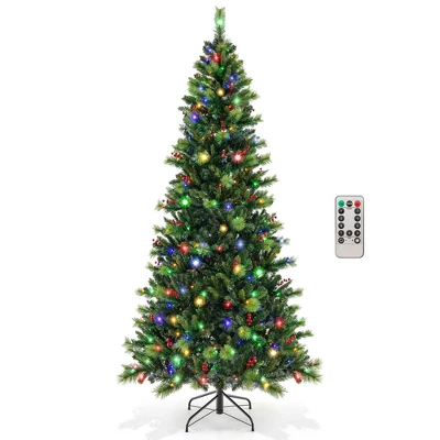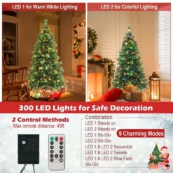 The stunning Xmas tree has 670/974/1272 branch tips that combine bright green pine needles & dark green vibrant leaves like real trees. Adorned with 28/36/43 clusters of vibrant red berries, it truly captures the spirit of Christmas. Illuminate your festivities with up to 300/400/500 LED lights, offering warm white & colorful lighting options with 9 mesmerizing modes, including LED 2 slo glo, LED 1 & LED 2 sequential, LED 1 & LED 2 twinkle, LED 1 & LED 2 slow fade, slo glo, etc. Control the ambiance effortlessly with the included remote, easily adjusting the timer for 6-hour on or 18-hour off & the 4-level brightness to create the perfect atmosphere. Crafted from safe & sturdy PVC, this Xmas tree is resistant to fire, fading & allergies, ensuring the safety of your family. It features an upgraded metal stand with a preinstalled bolt & hinged branch tips that expand automatically, so the setup is a breeze. We even provide 2 pairs of gloves to protect your hands. Embrace the joy of the season with our exquisite Xmas tree.