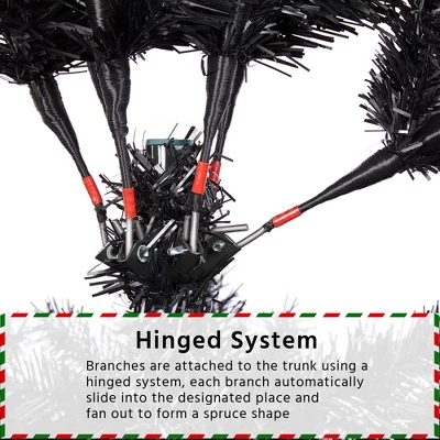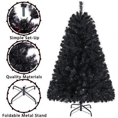 - This hinged spruce can stand out in various holiday decorations to set a dark luxury tone in your designated place. Premium PVC branches and tips are flexible to set and fluff out. Fire-resistant feature assured safety usage; Foldable stand is easy to store and pack; Non-skid rubber feet keep the tree stand in place; Versatile color & design make this holiday decoration widely applicable.